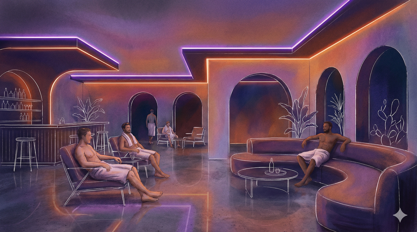 Adonis is a prominent men’s health club in Las Vegas, offering a variety of spaces for patrons. The main features include a central sauna with glass walls for visibility, an arcade with classic booths and glory holes for direct encounters, and a maze which features video rooms and dark corners for a choose-your-own-adventure experience. For those seeking privacy, the club also offers rentable rooms ranging from Twin to King beds as an upgrade from standard lockers.